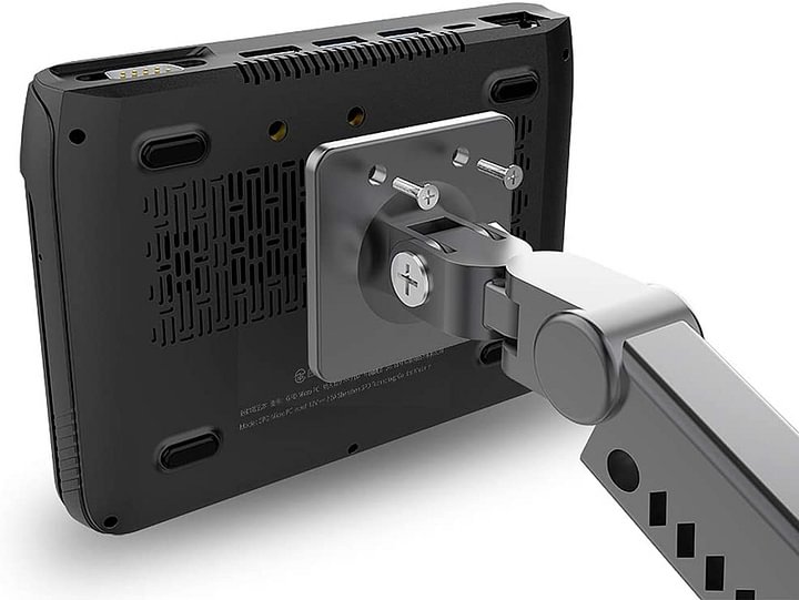 Două piulițe de cupru (potrivite pentru șuruburi cu diametrul de 2,5 mm) sunt integrate în spate pentru fixarea mașinii în diverse medii complexe. Îl puteți atașa la orice cuier rotativ, bază, lift, palet, suport și multe altele. MicroPC are un orificiu frontal pentru cablu ușor de utilizat pentru orice insignă sau cablu telefonic.