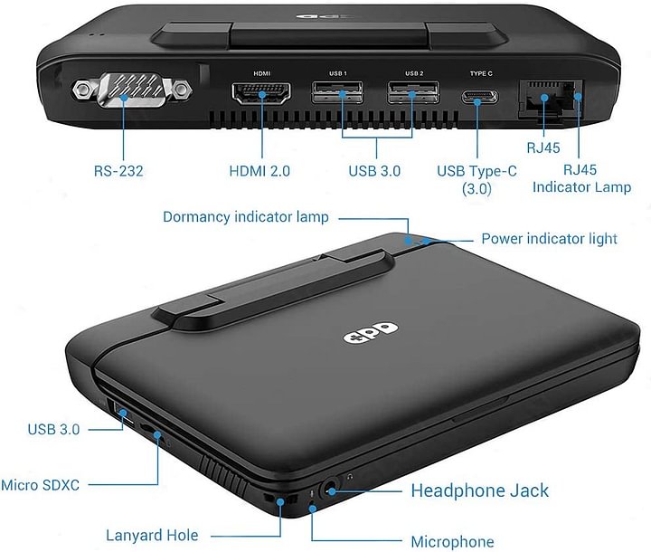 3x USB 3.0 Type-A, 1x USB 3.0 Type-C, 1x USB 3.0 Type-C, 1x RS-232, 1x Rj45, 1x Micro HDMI 2.0, 1x slot Micro SDXC, 1x căști și microfon de 3,5 mm.