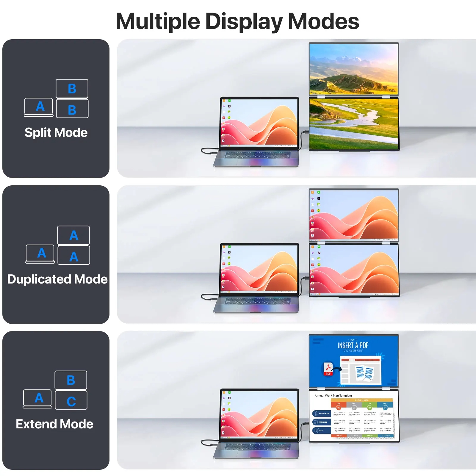 【Monitor pliabil versatil】 Împărtășiți ecranul fără efort în toate direcțiile cu rotație de 0-360 °, ideal pentru colaborarea cu colegii sau partenerii. Senzorii de gravitație încorporați permit rotirea automată la 180° și acceptă modurile duplicat, extindere, divizare, peisaj și portret pentru o comutare ușoară. Notă: Rotația de 90° nu este suportată, este necesară ajustarea manuală și se aplică numai la un singur ecran. Perfect pentru afișări simultane și independente pe mai multe ecrane. Pregătiți-vă să vă îmbunătățiți productivitatea